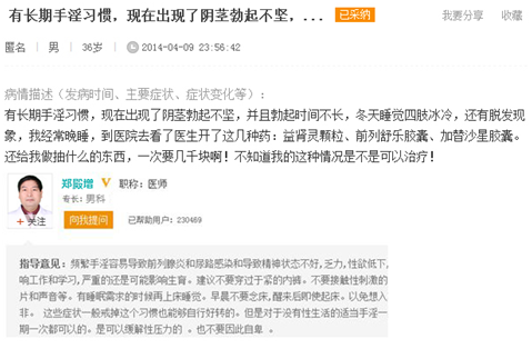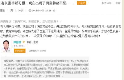 【他的案例】一位网友姜先生网上询问,长期手淫习惯,出现了阴茎勃起不坚,而且勃起时间不长等。医生告知易有早泄现象,具体情况需来院面诊。我也有类似情况,怎么办?