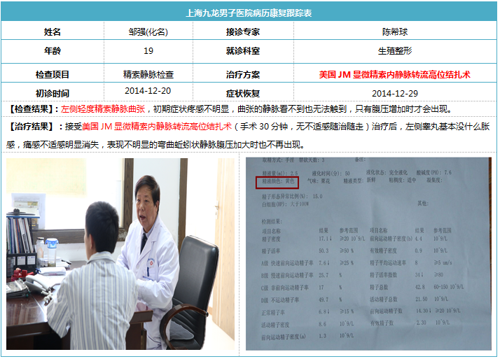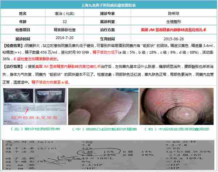 精索静脉曲张近年来发病率不断攀升,成年男性中大约有10%-15%患有该疾病!目前存在的精索静脉曲张治疗方式参差不齐,如腹腔镜手术、单纯精索内静脉高位结扎术、腹股沟结扎等,以致大多数男性患者难以抉择。上海九龙医院医师团结合多年临床经验指出:一般性手术术后短时间内睾丸组织及精液质量难以恢复正常,另外,手术存在漏扎可能。临床实例验证:美国JM显微精索内静脉转流高位结扎术不仅有效阻止静脉反流,缓解症状,打破局部血液瘀积对睾丸的危害,同时睾丸精子功能得到改善。100%避免一般性手术对组织的创伤,如大出血,漏扎,阴囊水肿等。精索同胞们,一生只做一次的手术你们选对了吗? >>>精索静脉曲张怎样治疗疗效好?点击问医师