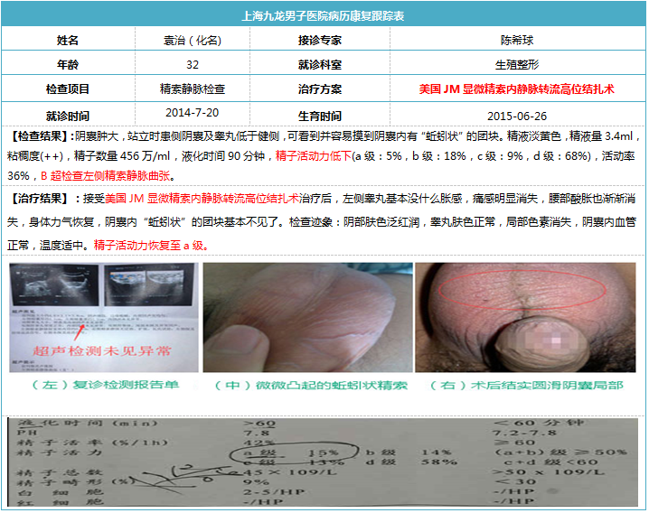 袁先生自述:和妻子结婚快3年了一直没能有孩子,去医院检查被诊断患有左侧精索静脉曲张,医生说我的精子活力低下,所以妻子才无法成功受孕。中国人的老思想作祟叫我不愿意正视自己的问题,起初我还责怪是老婆的肚子不争气,怪她生不了小孩......在这里我想给和我有相同思想相同情况的男性朋友一句劝告,只有勇敢正视自己的问题,早日接受正规治疗才是当务之急。