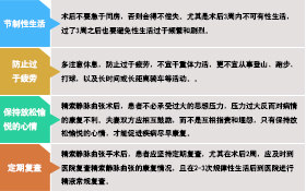 陈希求医师说:精索曲张术后康复率跟患者术后的护理是十分重要的。精索静脉曲张患者在术后要保持心情放松舒畅,注意饮食调整,不要吃辛辣刺激性食物,戒烟戒酒,不要长时间站立和坐立,注意劳逸结合。在术后一段时间内较好不要有过度频繁的房事,也不要经常手淫,保持阴囊和睾丸的清洁。随时注意自己的病情,询问医生及时进行病情沟通,一旦出现复发的病症一定要及时到医院进行复诊。医生精索曲张后多久能过性生活?一周就过了性生活有影响吗?