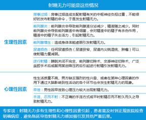 上海九龙医院泌尿外科医师韩用涛主任指出:射精无力也可称部分射精不全,它的特征是泄精正常而射精阶段异常,属于射精障碍。表现为在行房中情欲达到高峰而射精时却没有足够的力量将精液射入女性的阴道内的现象,常伴随这些症状:遗精、射精疼、 精液少、 器质性早泄、 精液稀等,主要由于生理性因素和心理性因素引起。射精无力可能会继发性欲减退、导致性冷淡甚至阳痿,影响夫妻感情,严重的由于射精无力导致精子精液无法正常运动从而影响生育等,患者需重视。我要直接和主任对话,点击进入医师免费询问专区