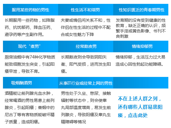 上海九龙医院韩用涛主任讲到:现代人出现勃起功能障碍问题通常是由于工作生活压力,不良生活习惯等引起,只有少部分是由于器质性方面原因引起,而在过往接诊患者中以下这些人群更易患该病。
