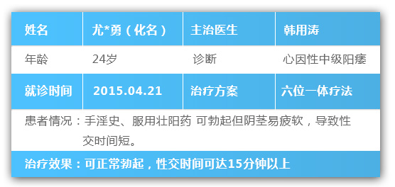【还好及时检查】21日上午,韩用涛接诊了这个小伙子,根据描述以及通过神经系统检查、阴茎血流量测定、和性激素三项全面检查,诊断其为精神性以及药物导致阳痿,达到中级程度,如若再不及时治疗,恐后期勃起困难。小尤庆幸及时检查。